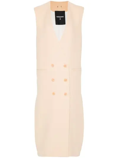 almond beige wool blend herringbone pattern sleeveless two side welt pockets side slits rear stud detail full lining double-breasted button fastening