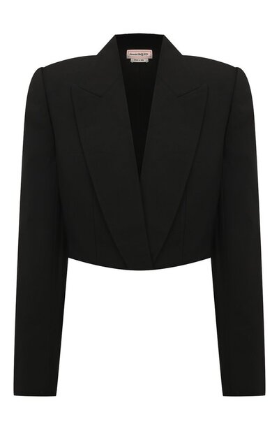 Укороченная длина делает черный жакет с акцентированной линией плеч и утрированно широкими заостренными лацканами особенно женственным. Для пошива модели использовали тонкую костюмную шерсть. Материал не мнется и хорошо держит заданную кроем форму, поэтому изделие с потайной застежкой долго будет выглядеть безупречно.