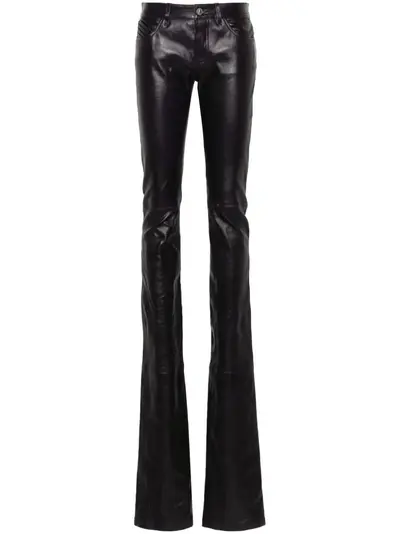black leather crinkled finish belt loops classic five pockets logo patch to the rear long leg front button fastening