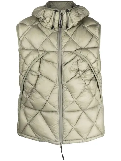cool grey feather down diamond quilting drawstring hood high neck front two-way zip fastening sleeveless two front patch pockets straight hem