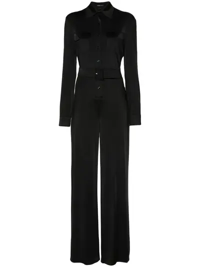 black stretch-jersey classic collar long sleeves with buttoned cuffs two chest button-fastening flap pockets belt loops detachable and adjustable waist belt two side inset pockets full-length two rear button-fastening flap pockets straight leg front button fastening