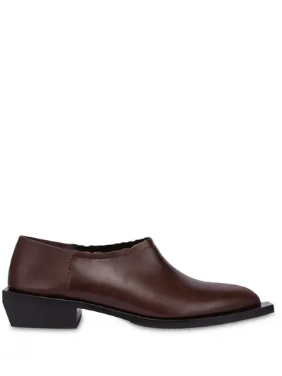 chocolate brown calf leather scallop edge logo print to the rear almond toe slip-on style branded insole low block heel leather sole