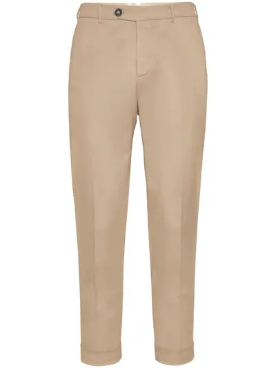 almond beige cotton blend twill weave pressed crease mid-rise belt loops concealed front button, hook and zip fastening tapered leg slip pockets to the sides two rear button-fastening jetted pockets