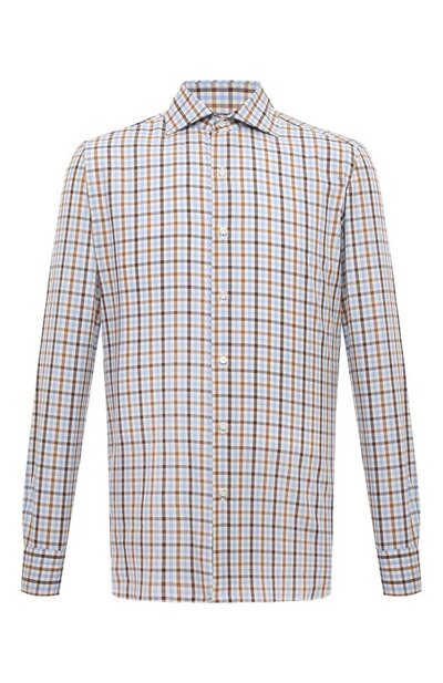 Рубашку в коричневую клетку сшили из мягкой хлопковой фланели. Легкий материал с ворсовой фактурой удерживает тепло лучше, чем вещи из гладких тканей, поэтому в модели будет комфортно в прохладную погоду. Изделие с длинными рукавами и воротником акула предлагаем сочетать со светлыми джинсами и высокими ботинками.