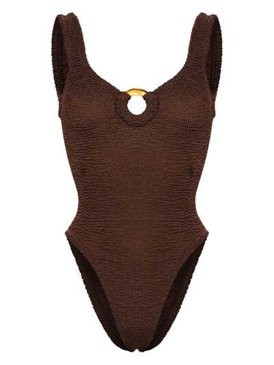 coffee brown crinkled finish stretch-design cut-out detailing tortoiseshell-effect detailing plunging U-neck sleeveless low back high cut unlined Be mindful to try on swimwear over your own garments.