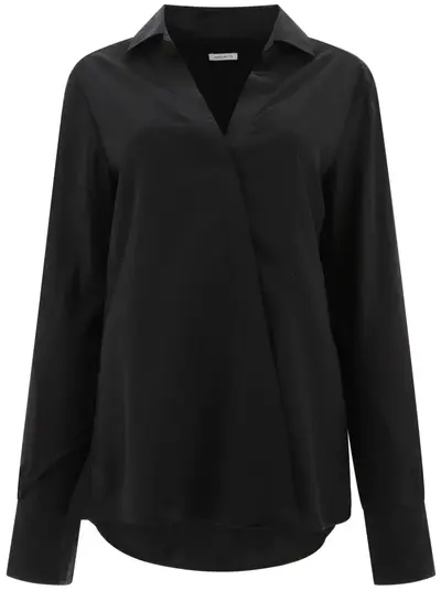 black TENCEL™ blend asymmetric design concealed front button fastening classic collar V-neck long sleeves buttoned cuffs rear curved hem