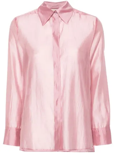 rose pink lyocell blend semi-sheer construction classic collar long sleeves with buttoned cuffs short side slits straight hem concealed front button placket