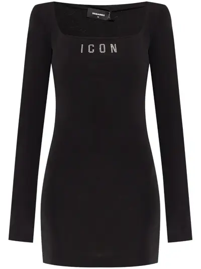black logo embellishment rhinestone embellishment square neck long sleeves straight hem thigh-length