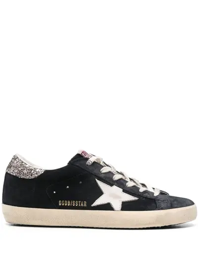 blue calf suede distressed finish logo-print tongue logo stamp at side signature star patch to the sides glitter detailing contrasting branded heel counter front lace-up fastening round toe branded leather insole flat rubber sole