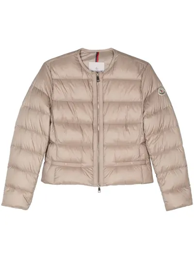 beige feather down padded design quilted logo patch at the sleeve grosgrain ribbon trim gold-tone hardware round neck front two-way zip fastening long sleeves two side stud-fastening pockets straight hem authenticity QR code