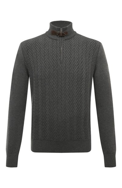 Серый свитер с шевронным узором спереди позаимствовал короткую молнию у поло, а высокую горловину, застегивающуюся кожаным ремешком, – у водолазки. Мастера итальянского бренда связали модель из тонкой кашемировой пряжи с почти невесомыми мягкими волокнами, полученными из отборного пуха горных коз. Такой материал сохраняет тепло лучше шерсти, но при этом весит намного меньше, поэтому одежда из него почти не ощущается на теле.