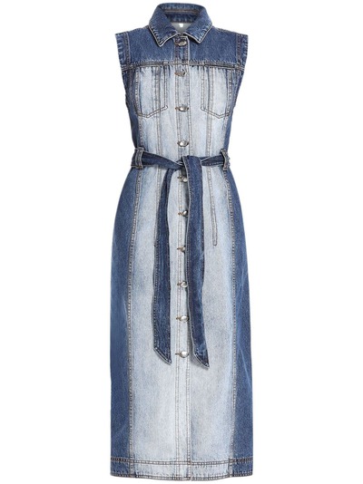 blue cotton denim bleach wash yoke design dart detailing belt loops classic collar front button fastening detachable and adjustable waist belt sleeveless two chest patch pockets slip pockets to the sides mid-calf length straight hem