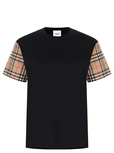 -Модель свободного кроя со спущенной линией плеча, короткими рукавами, круглым вырезом горловины и знаковым клетчатым мотивом Burberry Check на рукавах.
