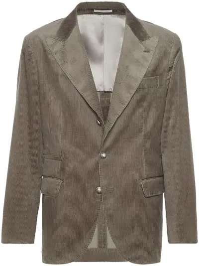 khaki cotton corduroy peak lapels front button fastening long sleeves buttoned cuffs chest welt pocket front welt pocket two side patch pockets English rear vents curved hem partial lining