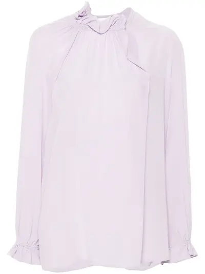 lilac silk crepe de chine ruffled detailing asymmetric neck long sleeves buttoned cuffs straight hem