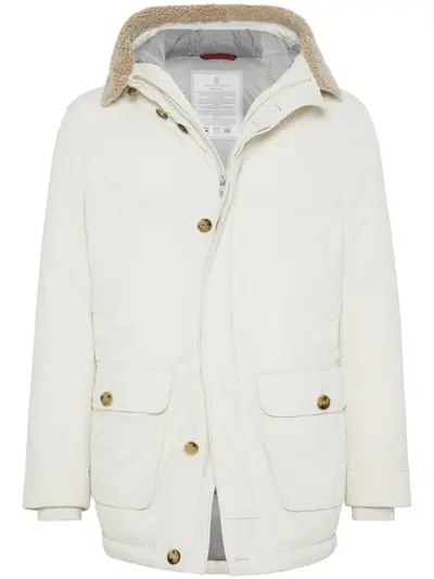 chalk white cotton blend goose down front button and zip fastening two front patch pockets classic hood