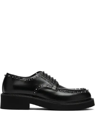 black calf leather polished finish silver-tone hardware signature Rockstud detailing rounded stud detailing round toe apron toe front lace-up fastening branded leather insole chunky sole rubber outsole