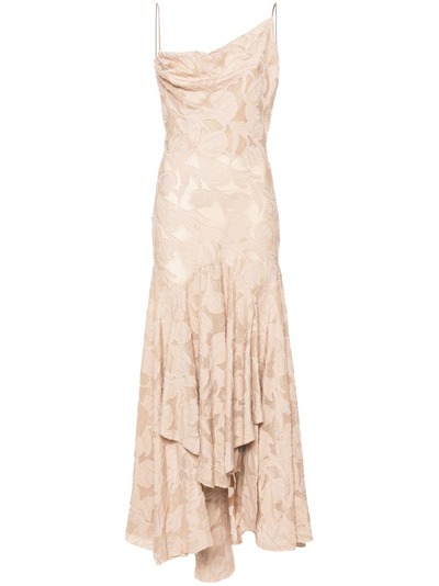 blush beige organza patterned jacquard adjustable spaghetti straps sleeveless asymmetric cowl neck boned bodice full-length asymmetric ruffle hem concealed rear hook and zip fastening rear tie fastening