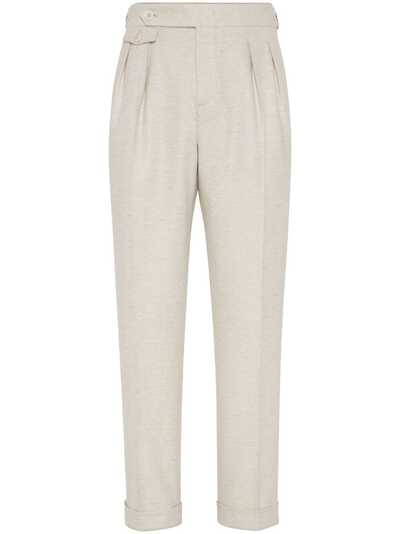 light beige wool-cashmere blend pressed crease off-centre front fastening adjustable side straps tapered leg two side inset pockets two rear button-fastening jetted pockets