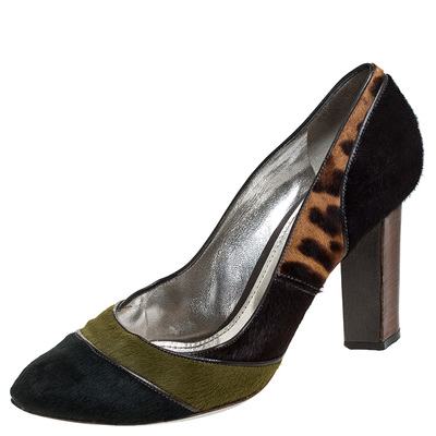 These multicolored pumps by Dolce and Gabbana are a must have. They are fashioned from pony hair and are have a distinct look. They feature a leopard print that enhances the other colors, 9.5 cm block heels and leather lined soles. They are a refreshing take on the classic pumps and can be worn with a host of occasions.