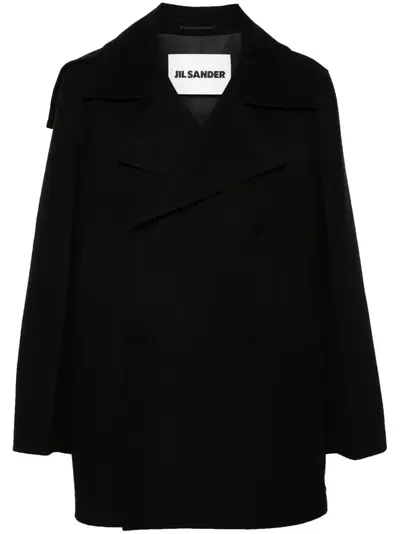 black virgin wool blend non-brushed fleece vertical seamed wide notch lapels double-breasted button fastening long sleeves two side welt pockets straight hem full lining above-knee length