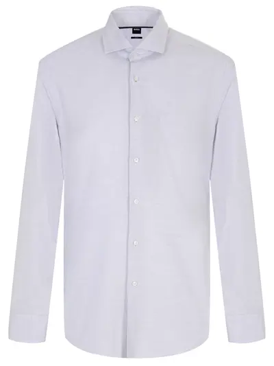 -Голубая рубашка из смесового хлопка от BOSS BLACK. -Модель приталенного кроя с длинными рукавами, манжетами на пуговицах, отложным воротником и застежкой на пуговицы. -Благодаря лаконичным цвету и крою рубашка дополнит офисные образы с брюками и классическим пиджаком.