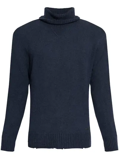 midnight blue wool-cashmere blend fine knit distressed finish silver-tone logo plaque ribbed cuffs and hem roll neck straight hem