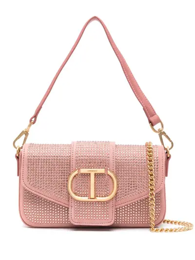 coral pink faux suede crystal embellishment signature Oval T logo plaque foldover top single detachable top handle detachable leather and chain-link shoulder strap main compartment internal logo tag contrast lining logo-engraved gold-tone hardware concealed magnetic fastening This piece comes complete with a protective dust bag.
