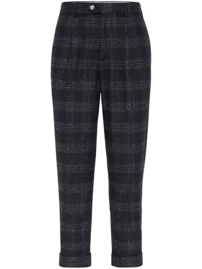 black wool-silk blend Prince of Wales check pattern pleat detailing slip pockets to the sides two rear welt pockets belt loops concealed front button, hook and zip fastening turn-up hem