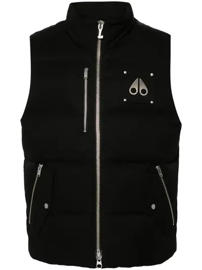 black gabardine weave quilted padded design down-feather filling silver-tone logo plaque at the chest logo-engraved silver-tone hardware stand-up collar sleeveless zip-fastening chest pocket two front flap pockets two side zip-fastening pockets two internal zip-fastening pockets front two-way zip fastening straight hem quilted lining