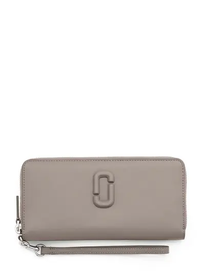 taupe grey leather smooth grain silver-tone hardware appliqué logo detachable wrist strap all-around zip fastening debossed internal logo internal card slots internal zip-fastening pocket contrast lining