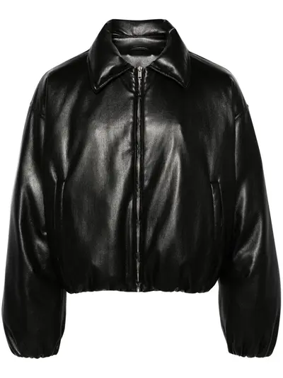 black faux leather padded design spread collar front zip fastening drop shoulder long sleeves with elasticated cuffs two side slit pockets straight hem elasticated hem full lining