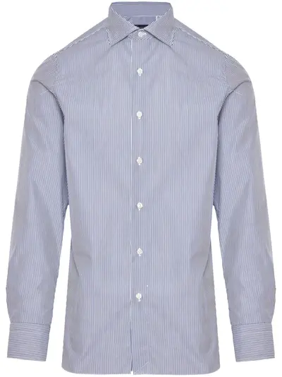 blue cotton vertical stripe pattern spread collar front button fastening buttoned-cuff sleeves long sleeves rear curved hem