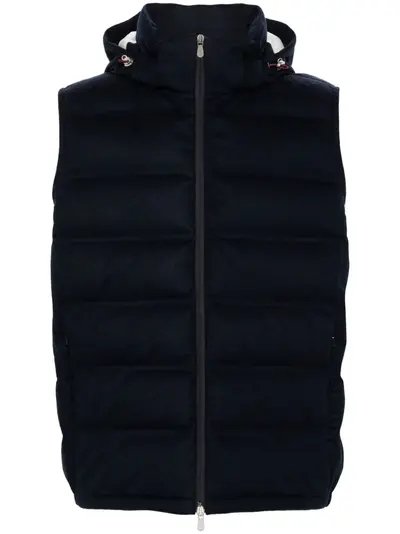 midnight blue wool down-feather filling quilted wind-resistant/water-repellent drawstring hood high neck front two-way zip fastening sleeveless two side zip-fastening pockets straight hem full lining