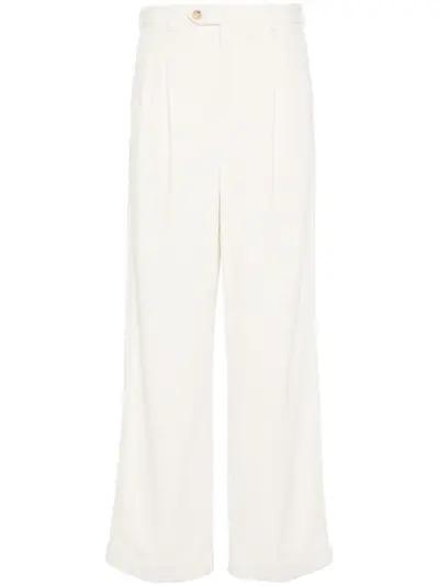ecru cotton blend tweed pleat detailing belt loops front button and zip fastening straight leg two side slit pockets two rear welt pockets turn-up cuffs