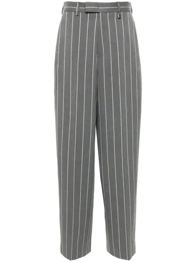 medium grey/white cotton tailored design vertical stripe pattern logo charm wide leg high-waisted concealed front button, hook and zip fastening belt loops two diagonal pockets to the sides two rear welt pockets pressed crease straight hem