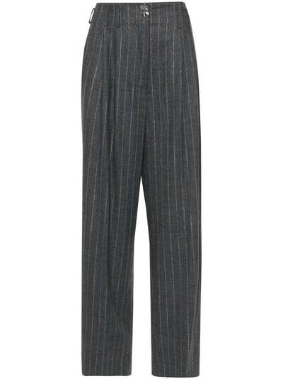 dark grey virgin wool blend pinstripe pattern metallic threading pleat detailing silver-tone buttons tailored cut high-waisted front press-stud and zip fastening belt loops two diagonal pockets to the sides rear flap pocket pressed crease straight hem