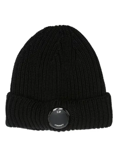 black merino wool ribbed knit round crown folded edge signature Lens detail pull-on style C.P. Company suggests removing any detachable accessories before washing.