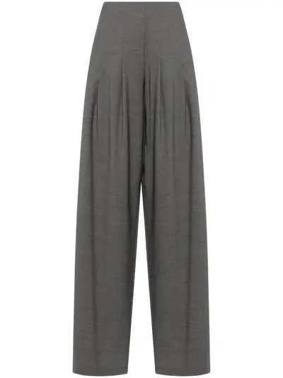 grey virgin wool blend dart detailing pleat detailing two diagonal pockets to the sides wide leg concealed side hook and zip fastening