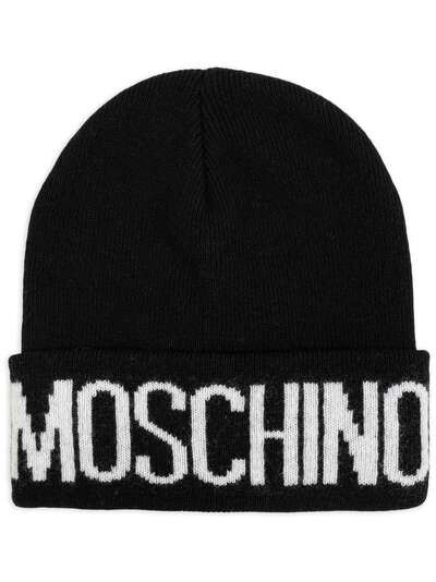 black/white knitted construction intarsia-knit logo oval crown turn-up brim pull-on style