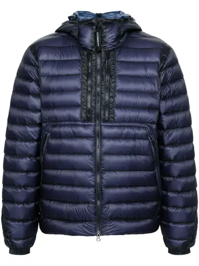navy blue shell ripstop texture down-feather filling padded design quilted signature Goggles detail drawstring hood funnel neck front two-way zip fastening long sleeves elasticated cuffs two zip-fastening chest pockets two side zip-fastening pockets internal drawstring fastening waist drawstring hem full lining C.P. Company suggests removing any detachable accessories before washing.