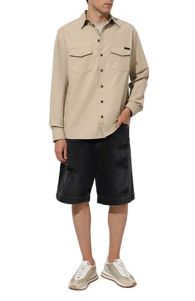 Рубашка силуэта Classic fit одинаково хорошо сочетается и с костюмными брюками, и с джинсами или шортами. Модель с бантовой складкой сшили из хлопковой ткани с добавлением нейлона. Один из накладных карманов спереди украсили кожаной брендированной нашивкой.