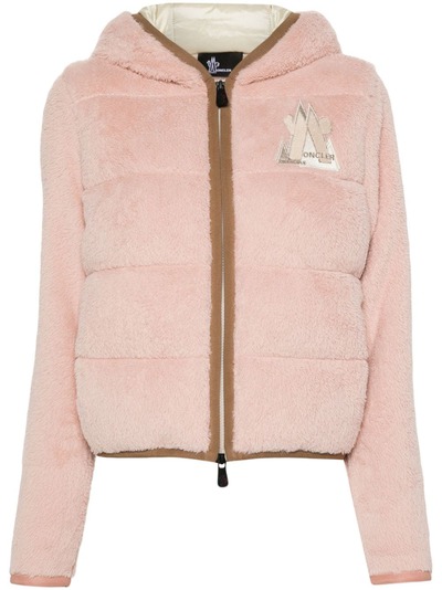 powder pink Polartec® High Loft™ stretch velvet padded panels down-feather filling contrasting trim classic hood long sleeves elasticated cuffs logo patch at the chest two side inset pockets mini logo tag to the side elasticated hem straight hem front two-way zip fastening