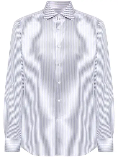 white/royal blue cotton twill weave vertical stripe pattern pleat detailing at the sleeves logo patch to the side logo-engraved buttons cutaway collar long sleeves with buttoned cuffs front button fastening curved hem unlined