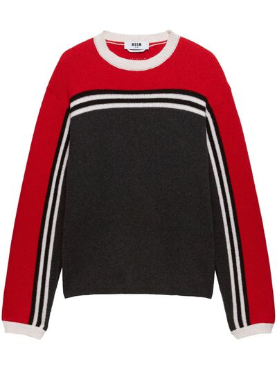 red/dark grey knitted construction colour-block design bright stripe pattern crew neck drop shoulder long sleeves ribbed cuffs straight hem