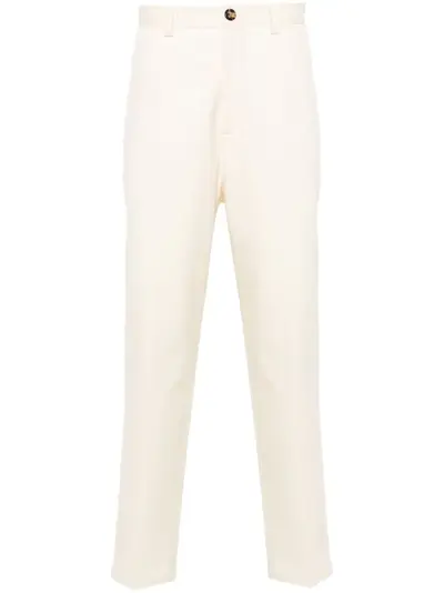 white cotton blend twill weave button fly fastening belt loops pressed crease straight leg coin pocket two side slit pockets two rear welt pockets