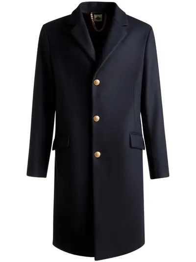 navy blue wool blend front button fastening shoulder pads embossed gold-tone buttons two side flap pockets straight hem long length