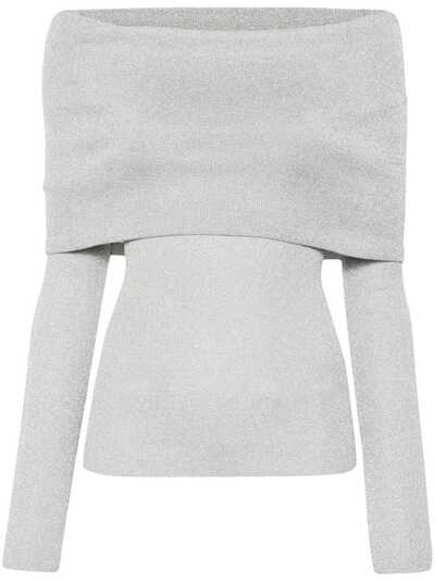 silver-tone metallic threading knitted construction fine ribbed off-shoulder long sleeves thumb slots straight hem