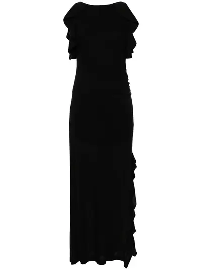 black lyocell-wool blend jersey texture crew neck sleeveless ruffled trim ruched detailing side slit straight hem long length