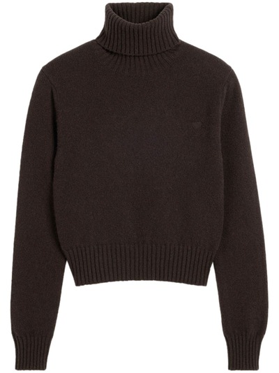 chocolate brown wool-cashmere blend knitted construction signature Ami de Coeur monogram motif roll neck long sleeves straight hem